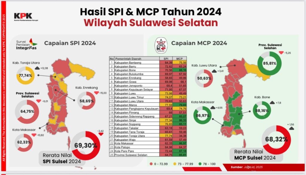 SINJAI – Komisi Pemberantasan Korupsi (KPK) telah merilis hasil Survei Penilaian Integritas (SPI) tahun 2024, yang menilai tingkat risiko korupsi dan upaya pencegahan korupsi di seluruh instansi pemerintah. Berdasarkan hasil survei tersebut, Kabupaten Sinjai masuk dalam kategori zona kuning dengan nilai 77,34 persen. Kategori zona kuning menunjukkan bahwa tingkat integritas di Kabupaten Sinjai berada pada level menengah, di mana masih terdapat sejumlah area yang perlu diperkuat untuk menurunkan potensi terjadinya praktik korupsi, kolusi, dan nepotisme di lingkungan pemerintahan. Survei SPI dilakukan secara independen oleh KPK. Penilaian ini mencakup aspek transparansi, akuntabilitas, pengendalian gratifikasi, pengadaan barang dan jasa, serta kualitas pelayanan publik. Pemerintah Kabupaten Sinjai menyambut hasil survei ini dengan komitmen untuk terus meningkatkan integritas dan kualitas pelayanan publik. “Peningkatan transparansi, penguatan sistem pengawasan internal, serta optimalisasi peran Aparat Pengawasan Intern Pemerintah akan menjadi fokus utama dalam menindaklanjuti hasil SPI 2024,” ujar Kepala Inspektorat Sinjai, Andi Adhea Syamsuri. Ditegaskan hasil ini akan menjadi bahan evaluasi bagi Pemerintah Daerah dalam memperkuat sistem pengawasan dan pencegahan korupsi di seluruh OPD. Selain Sinjai, Kabupaten/ Kota lainnya yang masuk dalam daftar zona kuning yakni Luwu Timur, Luwu, Toraja Utara, Soppeng dan Maros. Dengan capaian 77,34 persen, Sinjai masih memiliki ruang perbaikan agar ke depan dapat naik ke zona hijau, menandakan tata kelola pemerintahan yang semakin bersih, transparan, dan berintegritas. Sebagai informasi, SPI dibagi dalam tiga kategori yakni zona hijau menandakan tingkat integritas tinggi, zona kuning menunjukkan integritas sedang dan zona merah menggambarkan risiko korupsi yang masih tinggi. Sementara itu, untuk Monitoring Center For Prevention (MCP) KPK, Sinjai masuk dalam daftar zona hijau dengan nilai 86.33 persen.