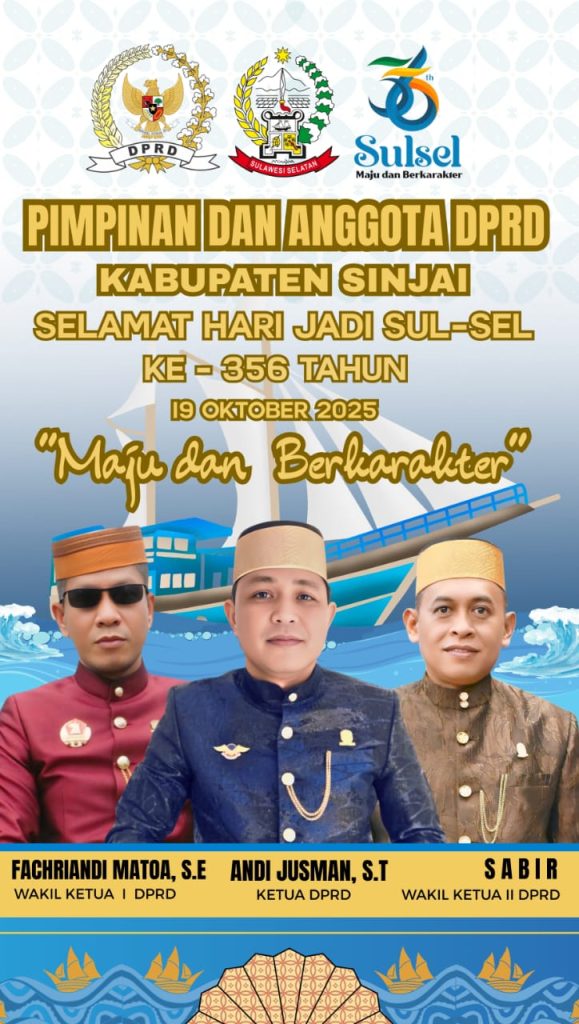 Suaraindonesiaku.com, Sinjai — Peringatan Hari Ulang Tahun (HUT) ke-356 Sulawesi Selatan yang akan digelar pada 19 Oktober 2025, semangat masyarakat untuk merayakan momentum bersejarah ini semakin terasa. Tahun ini, perayaan HUT Sulsel mengusung tema “Sulsel Maju dan Berkarakter”. Berbagai tokoh dan pejabat turut menyampaikan ucapan selamat atas hari jadi Sulsel. Salah satunya adalah pimpinan Dewan Perwakilan rakyat kabupaten sinjai, yang memberikan ucapan langsung melalui flyer portal media online serta media sosial lainnya. Sekedar diketahui DPRD Kab. Sinjai Periode 2024-2029 kini di pimpin oleh Andi Jusman sebagai Ketua DPRD Sinjai, Fachriandi Matoa sebagai Wakil Ketua I, dan Sabir sebagai Ketua II. Beserta anggota dewan lainnya yang saling membantu demi kemajuan pembangunan Kab. sinjai. Peringatan HUT ke-356 Sulsel ini diharapkan menjadi momentum untuk meneguhkan komitmen bersama membangun provinsi yang maju dan berkarakter, serta semakin memperkuat hubungan sampai ketingkat kabupaten. (Ruslan)